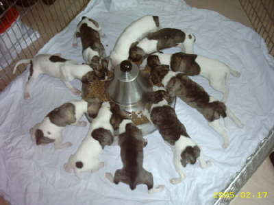 Nun sind unsere B's schon vier Wochten alt und essen gemeinsam aus der großen Schüssel.